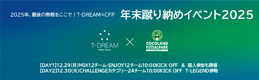 | 2025年12月29日 月曜日 18:00〜20:00 ココランドフットサルパーク 屋外人工芝コートにて開催! 今年は12月29日のみT-DREAM 村上さんの参戦が叶いませんでしたが 個サルの最後には太っ腹じゃんけん大会も実施します! ・小学生以上から参加可能 ・完全予約制(当日17時までにご予約ください) ※前日予約は20時まで、当日予約は朝9時から開始となります。 ※雨天決行、大雨の場合は、開始時間の2時間前に開催または、中止の判断をいたします。 ※キャンセルは開始時間の1時間前までにお願いします。 |