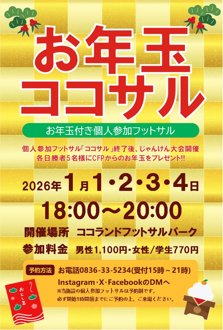 | ・ご予約は開始時間の1時間前までにお願いいたします。 ・年末年始ココサルは小学生以上からご参加いただけます。ただし、保護者同伴が原則となります。 ・年末年始ココサルでは、最少開催人数を設定いたしません。ご予約1名様から開催となります。 ・3対3や4対4など少人数ゲームが苦手な方は、ご予約の際にお伝えください。 ・定員を設ける場合がございます。必ずご予約の上ご来場ください。(原則36名様まで) ・定員オーバーの場合、ご参加をお断りすることがございます。ご了承くださいませ。 ・ココサル開始から30分経過してもご来場いただけない場合は、キャンセルとみなします。 ・ココサル終了後の集合写真は、ホームページやtwitter・facebookに掲載いたします。ご了承くださいませ。 ・競技志向ではありません。参加者には女性、初心者もいます。ひとりよがりなドリブル、無謀なシュート、強引なディフェンスはお控えくださいませ。 ・後ろからのチャージは絶対にしない。 ・審判はいますが、厳しくジャッジいたしません。通常のフットサルルールを厳守でお願いします。 ・スパイクシューズのご利用はお断りいたします。 ・怪我の予防のため、レガース(スネあて)の着用を推奨します。 ・また、アクセサリー類(指輪・ネックレス・ピアス・時計)等も怪我をされる可能性がありますのでご注意下さい。 ・どのココサルもエンジョイの精神でご参加ください。 ・当施設利用上の注意事項を厳守してください。 ・参加するにあたり以上の注意事項に同意したとみなします。 ・怪我をされた場合応急処置は行いますが、それ以上の責任は当施設では一切の責任を負いかねます。 ・各自でスポーツ保険等、傷害保険に加入される事をお勧め致します。 ・安全確保、円滑な進行の為、スタッフの指示や諸注意を厳守くださいませ。 以上、ご理解・ご協力よろしくお願いいたします。 |