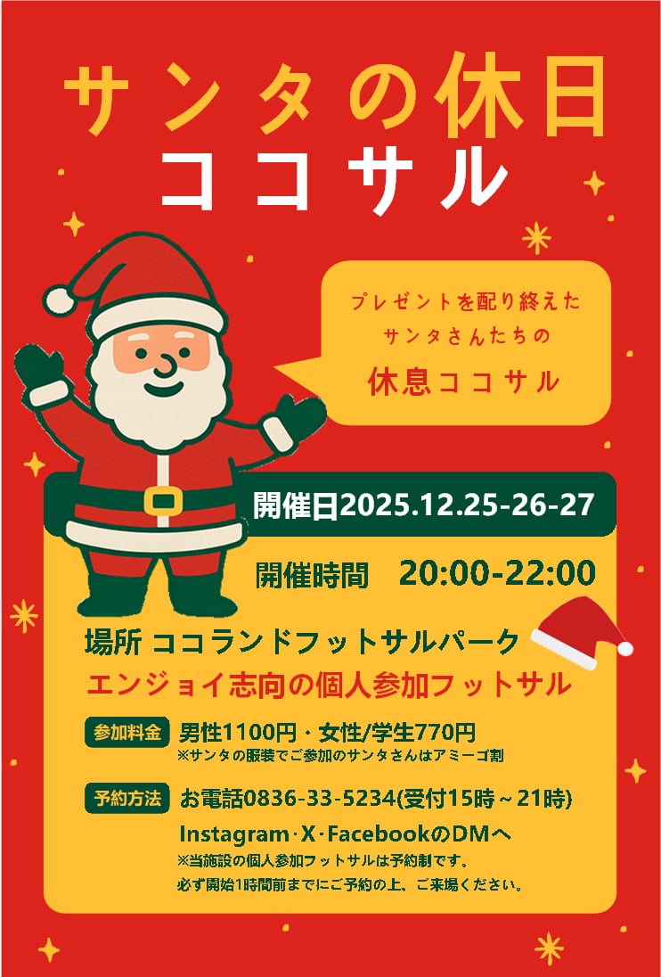 | ★個人参加フットサル「ココサル」参加方法 お電話・施設SNSへのDM・FAX・ホームページ右上のお問合せボタンからお申込みください。 お申し込みの際は、 ・お名前 ・ご連絡先(緊急連絡のとれる番号) 以上の事項をご記入または、お伝えください。 ※当施設のココサル参加に関する注意事項をよく読んでからお申込みくださいませ。 ※エントリーが完了した時点で、注意事項・施設規約にご同意いただけたものとみなします。 ※ご連絡なしのキャンセルは、キャンセル料お支払いの対象となります。(100%) |